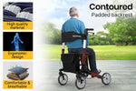 Venture outside on the large 8” wheels which are designed to roll smoothly over the bumps inside and outside, and have reflectors for peace of mind. The comfortable seat with padded back rest comes in handy when you’ve found a pleasant spot to watch the world go by, or perhaps simply feel like a rest when waiting in line. Simply push the handles down and the walker is locked into place.