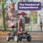 Regain independence the new FreeRoam Series II Mobility Scooter from Equipmed. The controls are simple and intuitive for anyone to become familiar with, and rear suspension ensures a smooth ride. It has a sensible speed of up to 8km/h, a generous range of 15-25km and a battery level meter on the dash. Further convenience is assured thanks to Flat-Free tyres that never require filling with air!