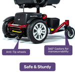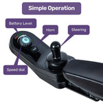 This Equipmed motorised wheelchair has many features; Anti-Tip Rollers, Dual Electronic Brakes with Downhill Overspeed Control, and a Horn button on the controller.
