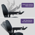 You can tailor the wheelchair to you by adjusting the seat and footrest height and the angle of the backrest. The armrests can be adjusted to the ideal width and have an ergonomic concave design. You can even set up the joystick controller to your preferred side and position!