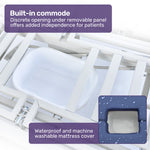 - Integrated commode – Discreetly positioned under the bed with removable mattress section for easy access